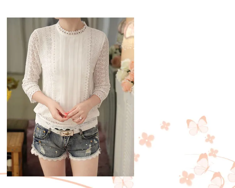 Spring / Autumn Korean Stand Collar Three-Quarter Sleeves Pleated Hollow Out Lace Blouse