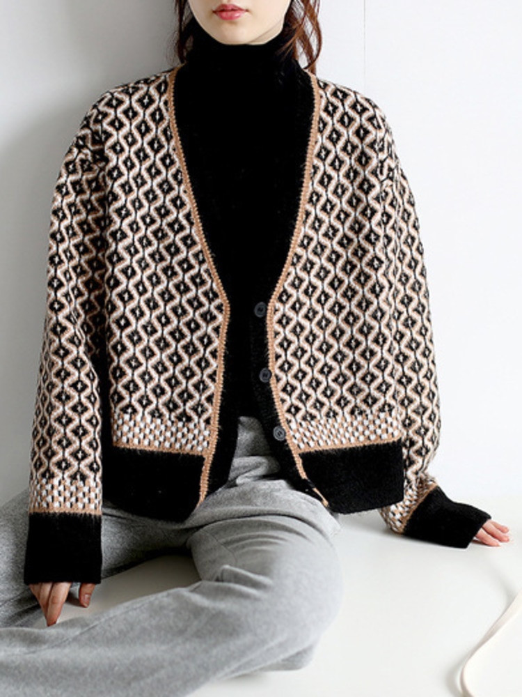 Cozy up in style with this Spring/Autumn V-neck rhombic knit cardigan. Thick hem, soft texture, and perfect for layering. Stay chic & warm!