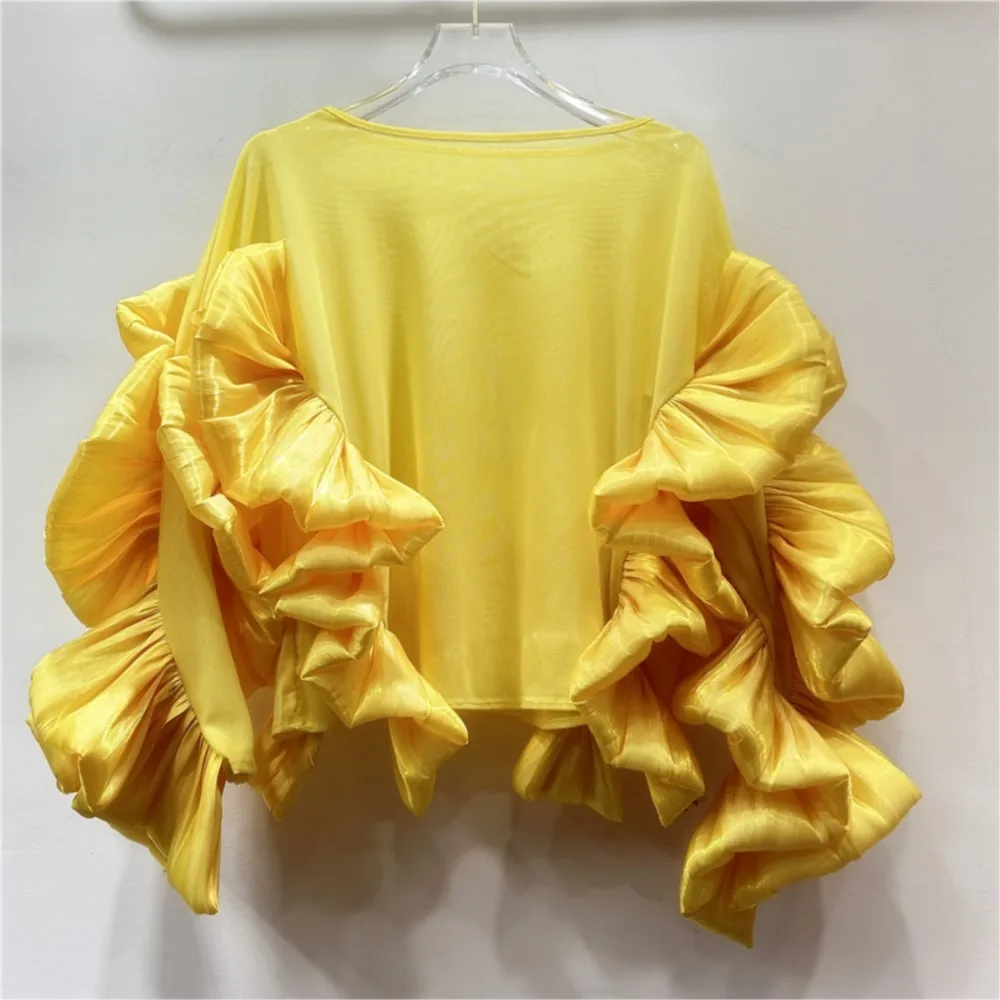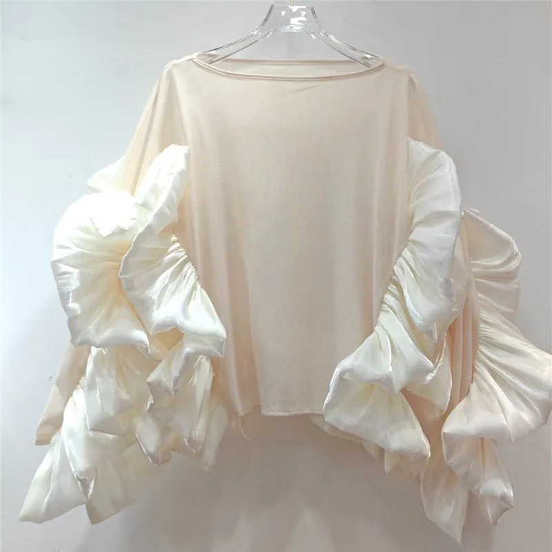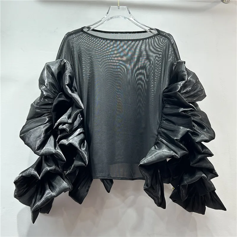 Spring Boat-Neck Long Sleeves Organza Ruffle-Volume Solid Blouse